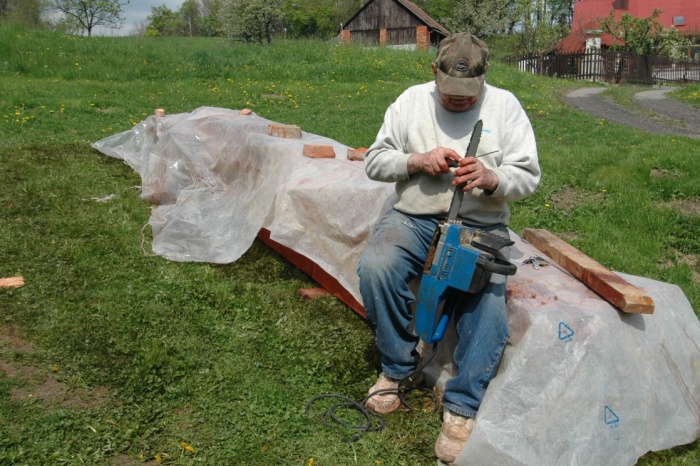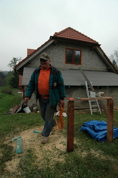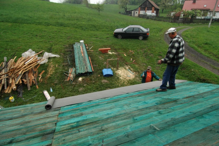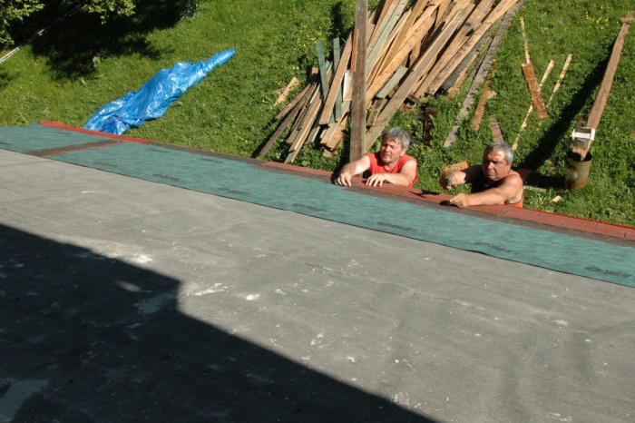 Výměna střechy byla dočasně zakončena položením první hydroizolační vrstvy. Důvodem byla navazující stavba zateplění. Takže, jakmile byla zateplena severní štítová zeď a dokončena fasáda, byla položena druhá vrstva, neboť ta první se poškodila při zateplování - ale s tím jsme počítali.