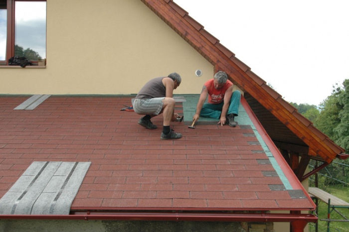 Na druhou vrstvu přišla nakonec definitivní krytina - použili jsme barevně sladěnou krytinu z asfaltových šindelů. Chtěli jsem krytinu lehkou, nebo´t v zimě bývá na střeše i velmi velká vrstva sněhu a ten, když navlhne a taje - může být i pěkně těžký.