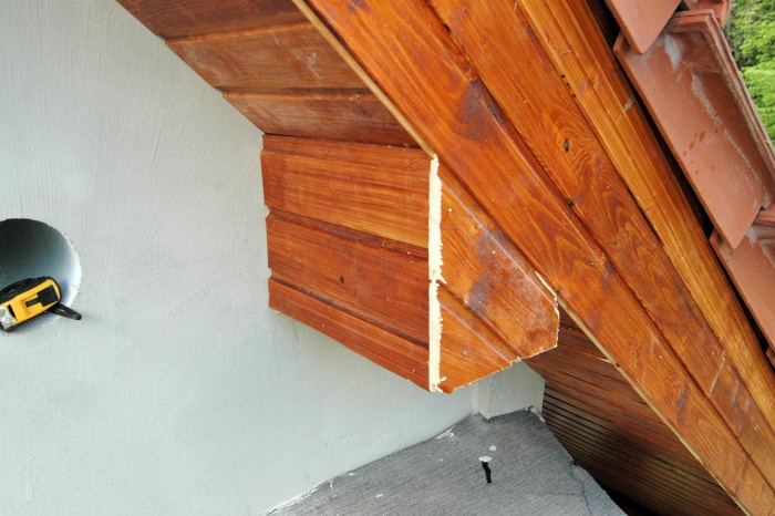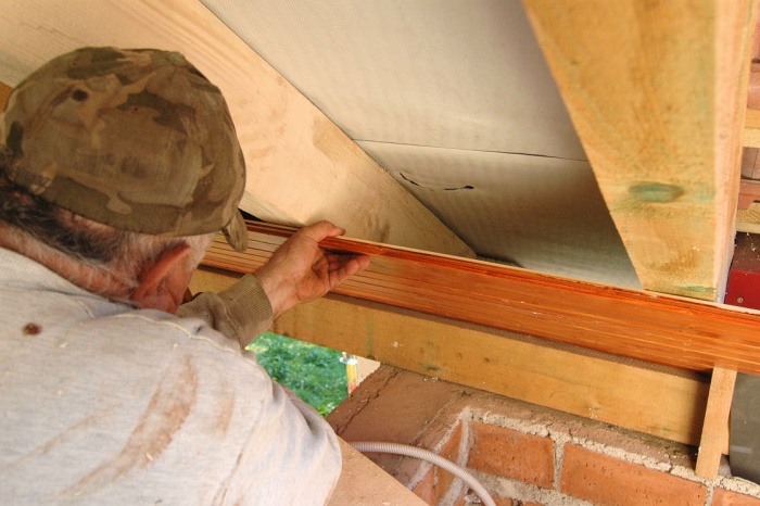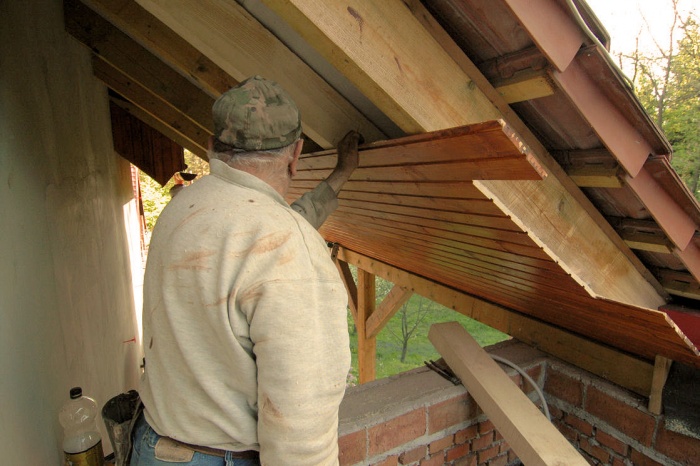 Plocha pro podbití palubkami byla poměrně velká. Tím, že jsme protáhli střechu na západní straně poměrně hodně mimo půdorys baráku, jsme získali sice možnost chůze s relativně suchou nohou kolem baráku, ale přibyly nám starosti s přesunutou střechou.