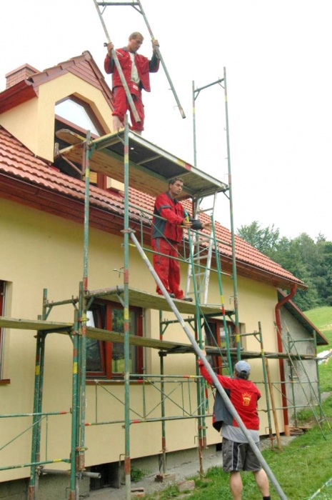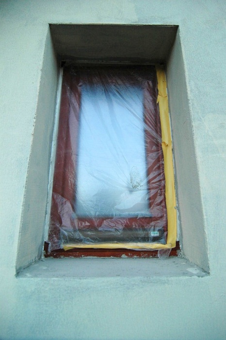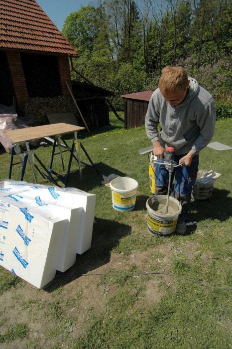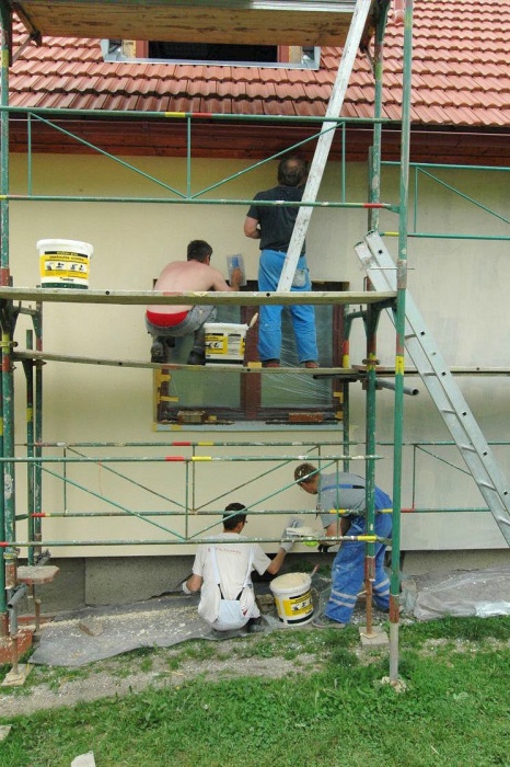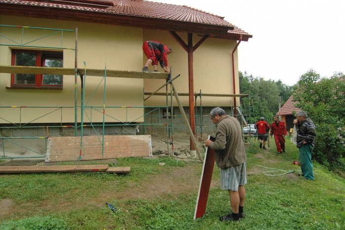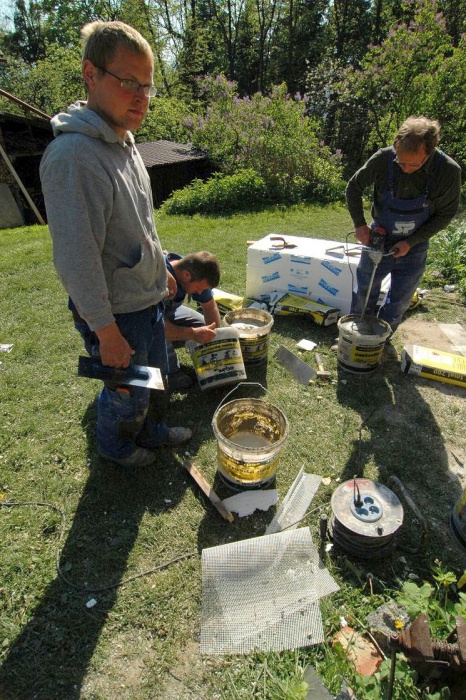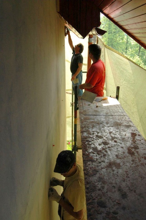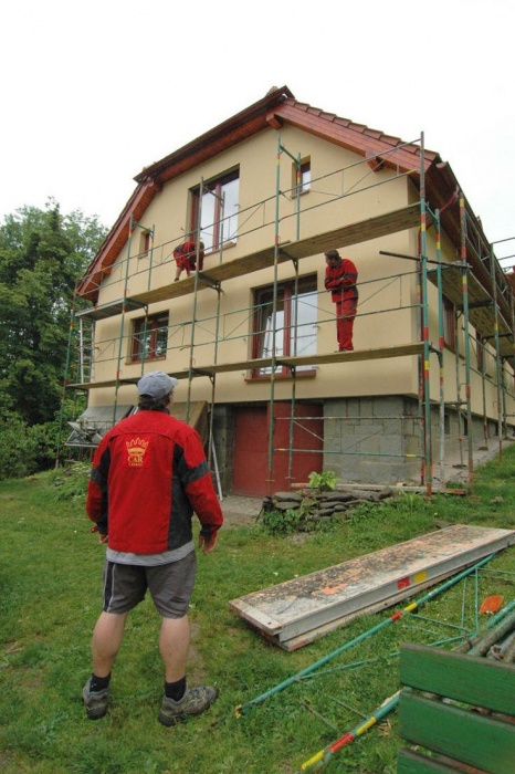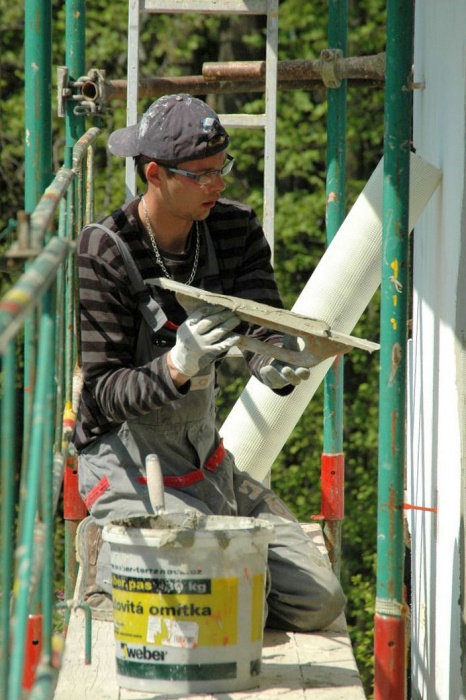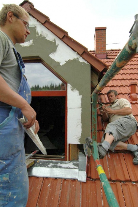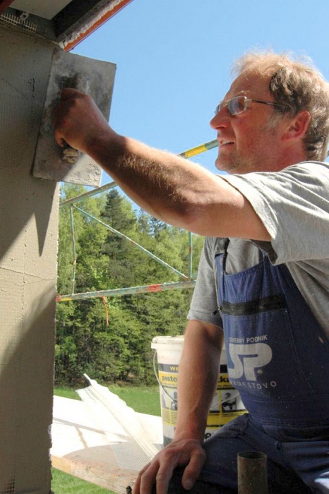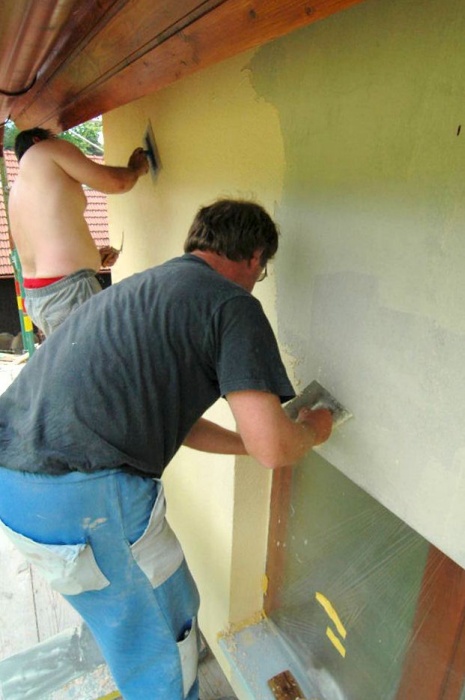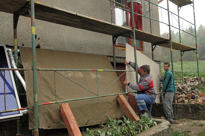 Zaskočilo nás počasí, nejprve se pohybovaly teploty kolem nejnižší povolené hodnoty pro lepení, později nám na fasádu pršelo a my museli shánět plachty na zakrytí a nakonec - v okamžiku nanášení závěrečné fasády si sluníčko řeklo, že se na tu krásu podívá a pražilo a pražilo. No a to také není nejlepší. Museli jsme naopak stínit.