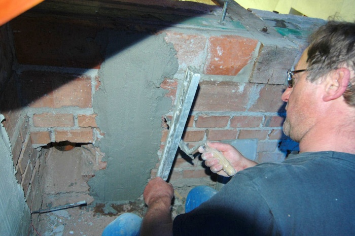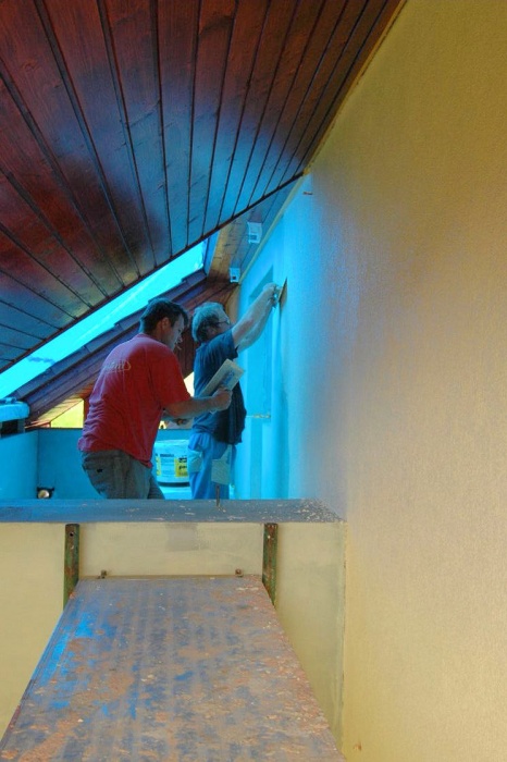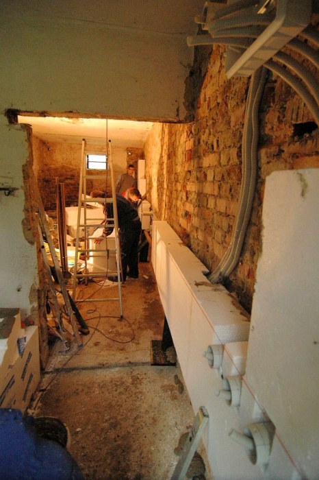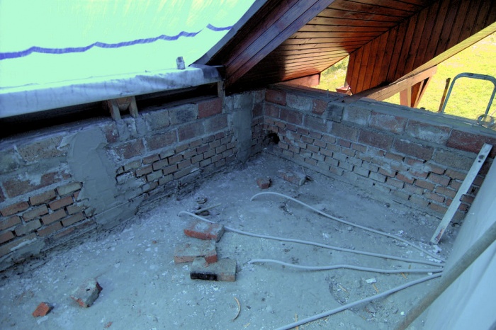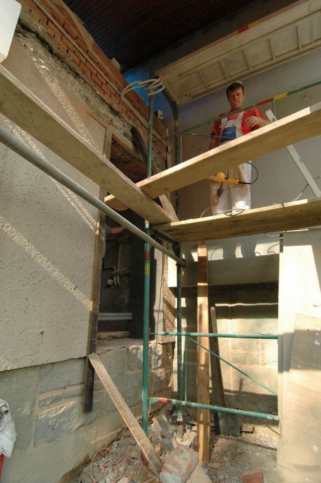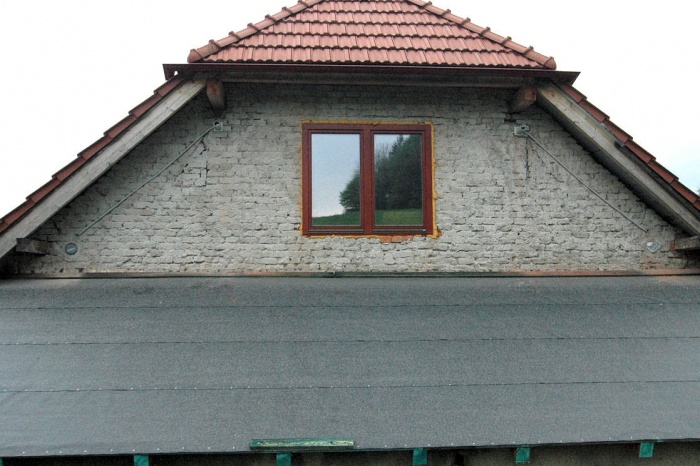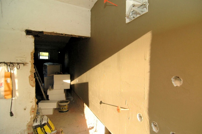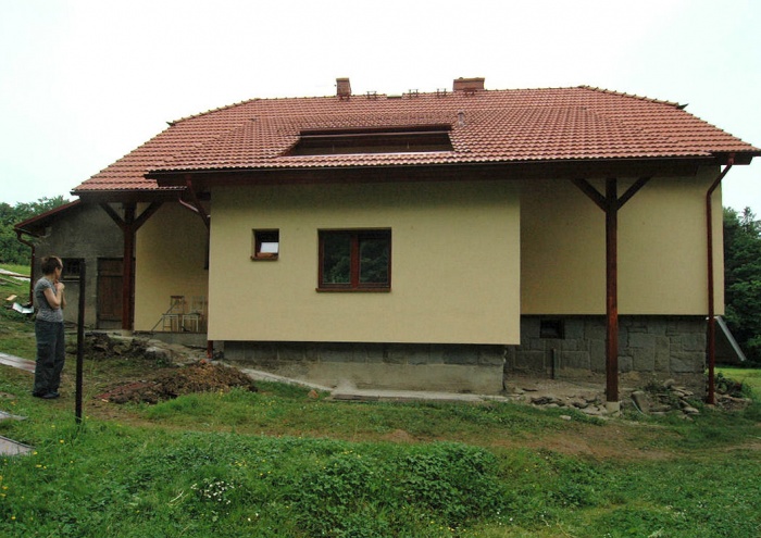 Obavy jsme měli ze severního štítu. Ten jsme před zahájením prací kompletně zbavili omítky (byla zvětralá) a nanesli cementový nástřik pro zpevnění. Stěna však byla tak, jak ji naši staříčkové postavili - prostě, jak se dařilo. Takže, nic nebylo rovně a bylo nutné neustále podkládat a vyrovnávat.