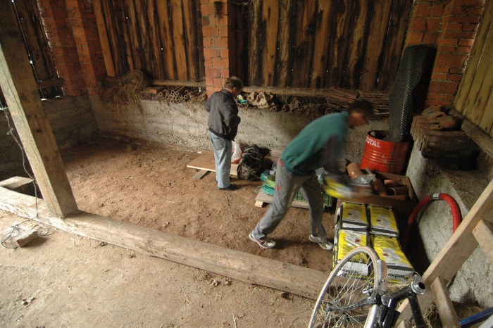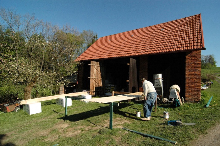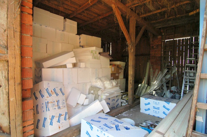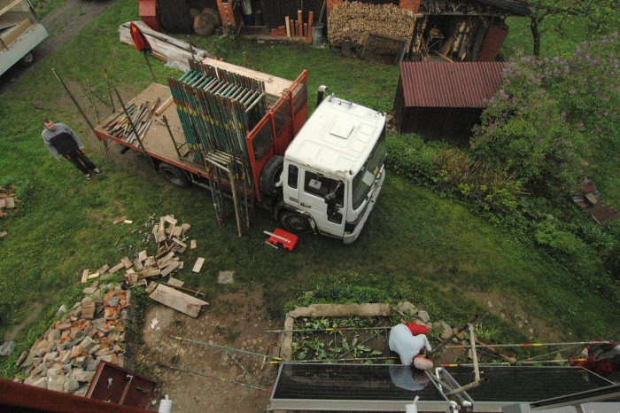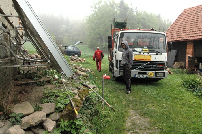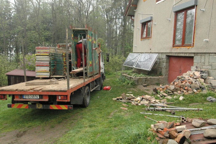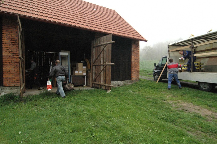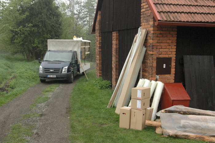 To byl velký oříšek. Dnes to je jasné, máme stodolu, tak do stodoly. Ale - to by musela být vyklizená.... a tak jsme museli v předstihu odvést nevídané množství stoletého sena a slámy (už jen problém, kam s tím...), vyklidit všechny trámky, klacky, zbytky nářadí, zetlelé cosi... no bylo toho hodně. Ale výsledkem byla půlka celé stodoly plně připravena přijmout veškerý materiál.