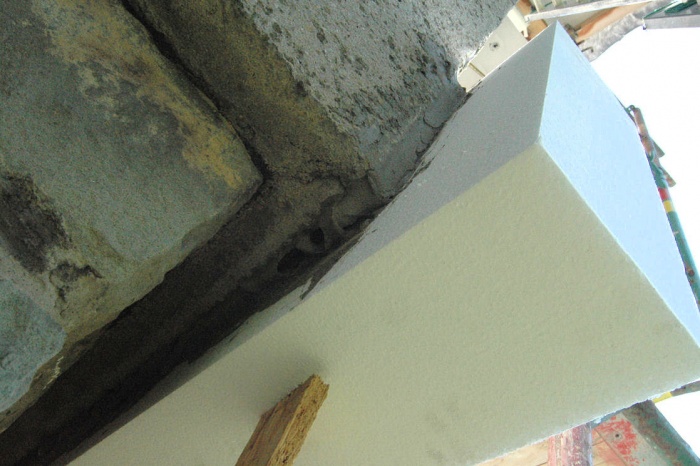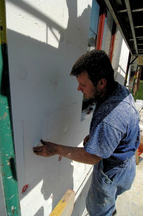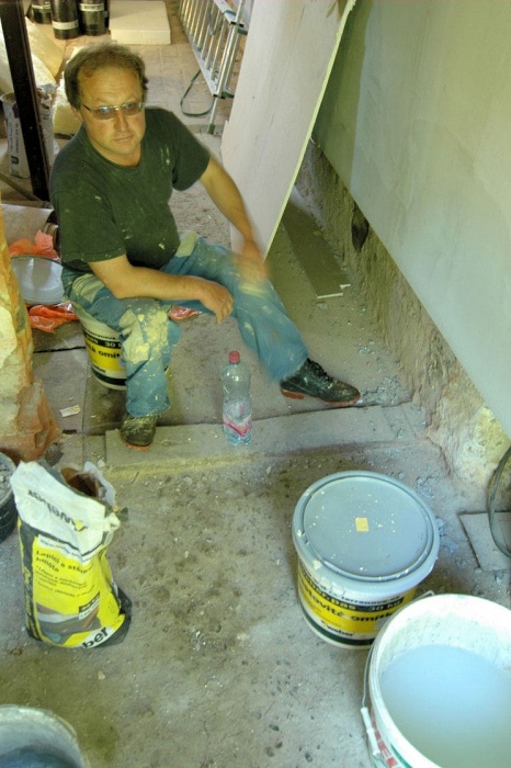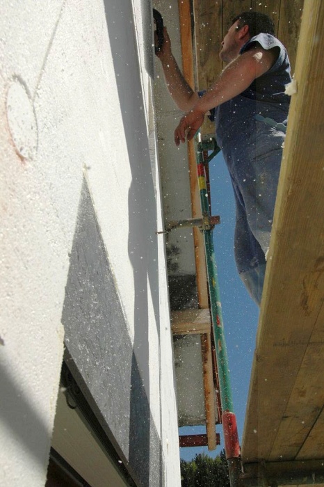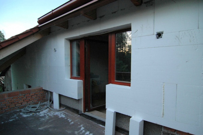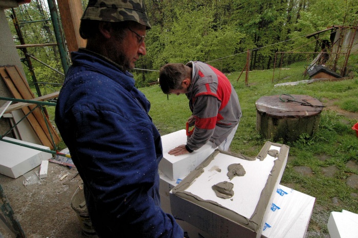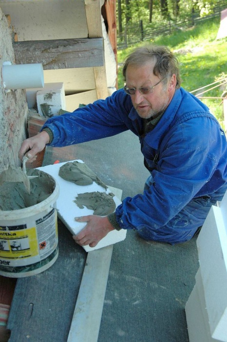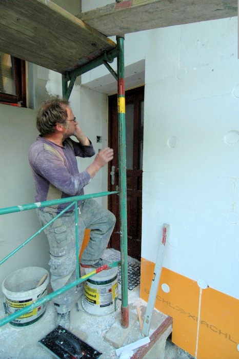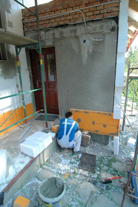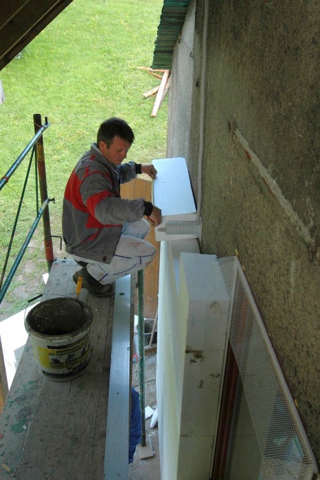 V těchto místech není vhodné použít běžný zateplovací polystyren, ale kvalitnější desky XPS. A tak již nalepený polystyren musel pryč a na jeho místo se lepily desky XPS. Ještě, že jsme si to uvědomili...montážníci z toho nadšeni nebyli.