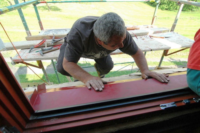 A další zpoždění při výstavbě bylo na světě. Chvilku to trvalo, než zhotovitel zajistil hliníkové zakončení. Montážníci usadili parapety na tzv: "chemické hřebíky", práce to byla rychlá a za chvíli bylo hotovo.