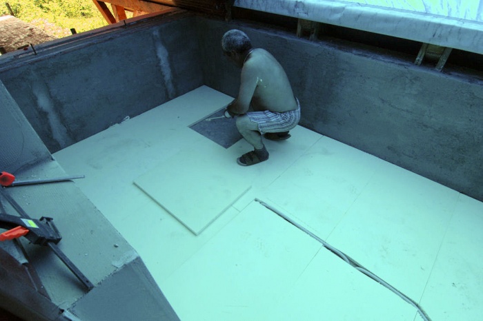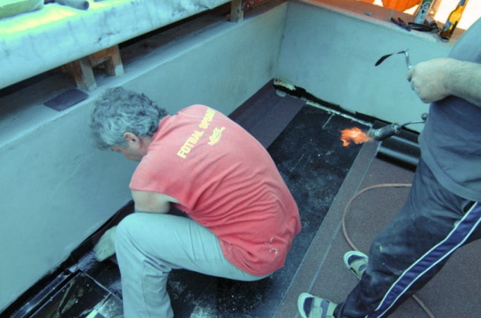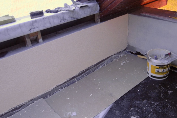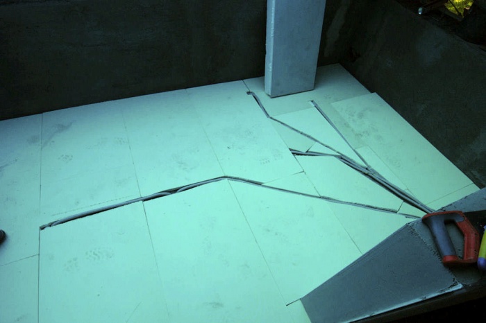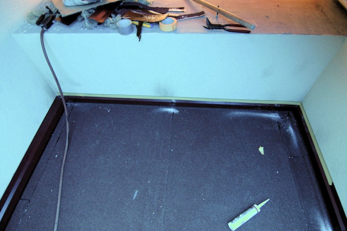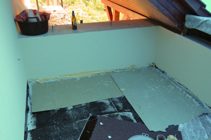 Jedná se o plochu s vodorovnou izolací a ta snad nikdy dobrotu dlouhodobě nedělá. Navíc, ukázalo se, že podlaha balkónu, neboli strop předsíně, je velmi málo izolován, v zimě (při -16°C)jsme naměřili povrchovou teplotu stropu 9°C a to je zoufale málo. Při rekonstrukci musely všechny vrstvy, kromě nosných panelů, pryč. Nahradit je musela tepelná izolace. A to čím více, tím lépe. Takže, bourací kadivo do ruky a už to lítalo. Z celkových cca 17cm vrstev zůstako jen 10cm panelů. Na to polystyren pro vyrovnání spádu a vytvoření mezivrstvy pro husí krky na rozvod elektriky. Na polystyren pak přišla deseticentimetrová vrstva tzv.pochozího polystyrénu. Vrstva izolace a na to ještě jedna. S odtokovým kanálkem byl probém. Zhotovitel neměl k dispozici vodováhu a než jsme na to přišli, bylo hotovo. Nebe nám bylo milostivo a seslalo na zem zkušení množství dešťové vody. Že jsme měli vodu až v přesíni ani nebudu vzpomínat. Tak znovu - sejmout, upravit, vložit a utěsnit. Nyní jsme přírodu nahradili kýbly vody a opravu bylo nutné zopakovat. Ach jo...