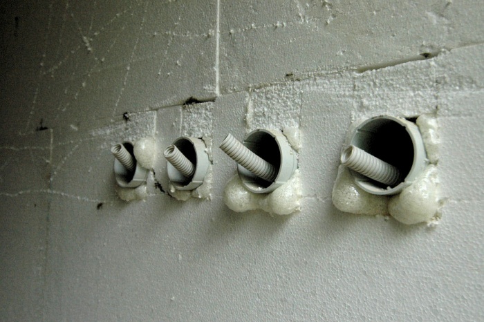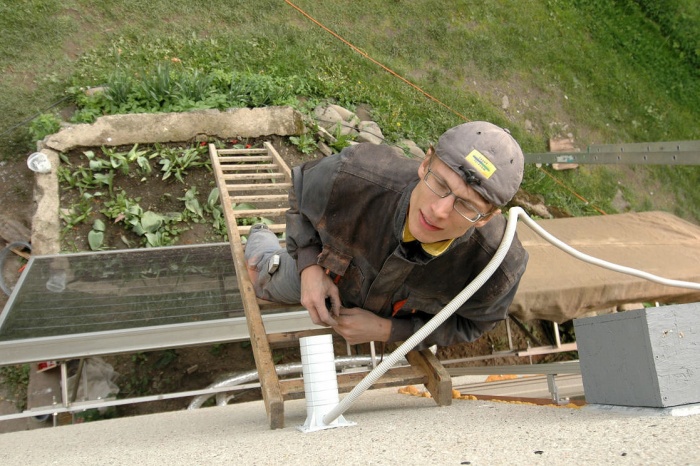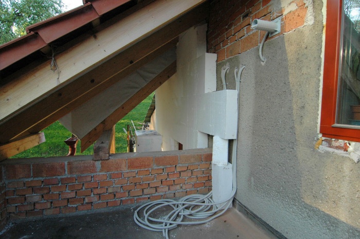 Instalace je jednoduchá, komínek se připevní před zateplením na svislou zeď, vnitřkem se protáhne "husí krk" a do komínku se vloží připravená polystyrenová vložka jako izolace. Po zateplení se komínek zkrátí a nakonec se před závěrečnou vrstvu fasády připevní nosná deska, nebo montážní krabice. Jednoduché, spolehlivé a hlavně, funkční. Pro nalezení přívodního otvoru a trubky jsme při závěrečném nanášení omítky vložili do otvoru pro kabel plastový hřebík, který tam zůstane do doby montáže světla, či jiného zařízení.