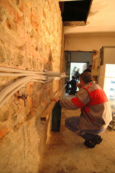 Zásadním problémem byla příprava rozvodů pro vnější osvětlení. Dlouho jsme zvažovali, jakým způsobem fasádu osvětlíme, nakonec byla stanovena místa, kam budou upevněny světelné zdroje. Na tato místa bylo nutné přivést napájecí kabel. Našli jsme výrobek, který zcela splnil naše požadavky - dostatečně pevný, aby unesl i větší zátěž, není na fasádě vidět a splňuje požadavky dostatečné tepelné izolace.