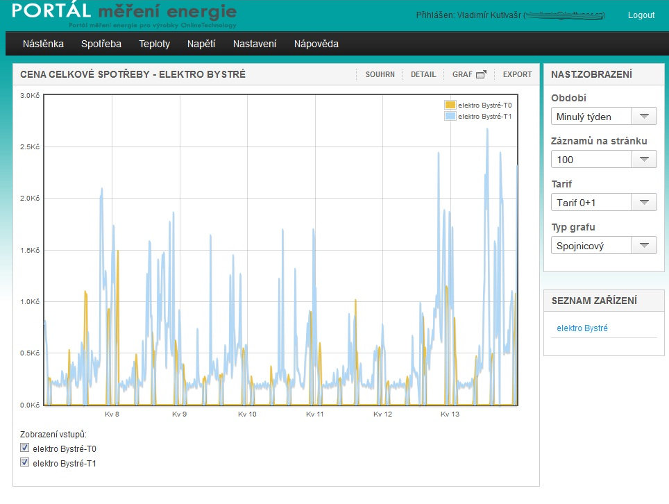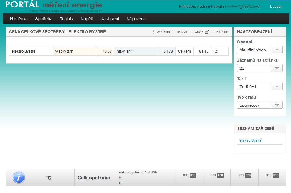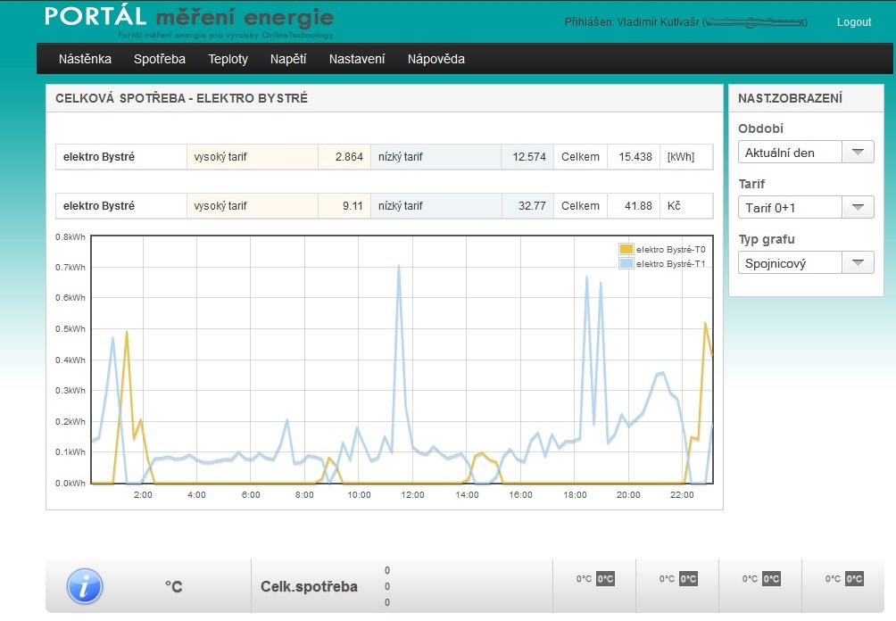 Na první stránce je tzv: nástěnka. Zde jsou zobrazeny základní naměřené a uložené údaje - celková spotřeba za zvolené období v obou tarifech, přepočítána celková cena za spotřebovanou energii a vše je pěkně znázorněno v grafické podobě.