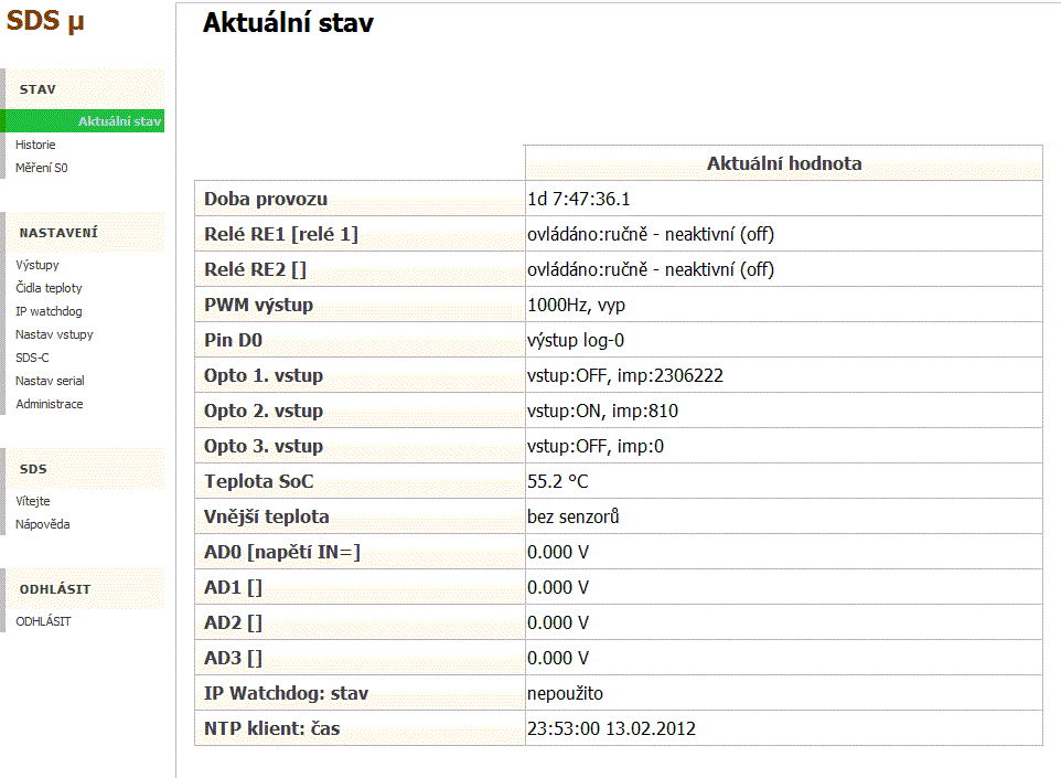 SDS má vestavěno jednoduché WEB rozhraní, na kterém lze zobrazit aktuální stav vybraných vstupů.