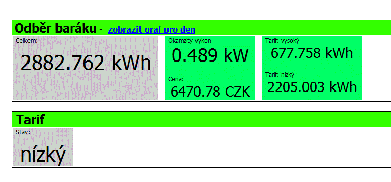 Jak je zřejmé - aktuální stav je "nízký tarif" , aktuální příkon baráku je 489 W (zřejme jede server, čistička a nějako to světlo...)