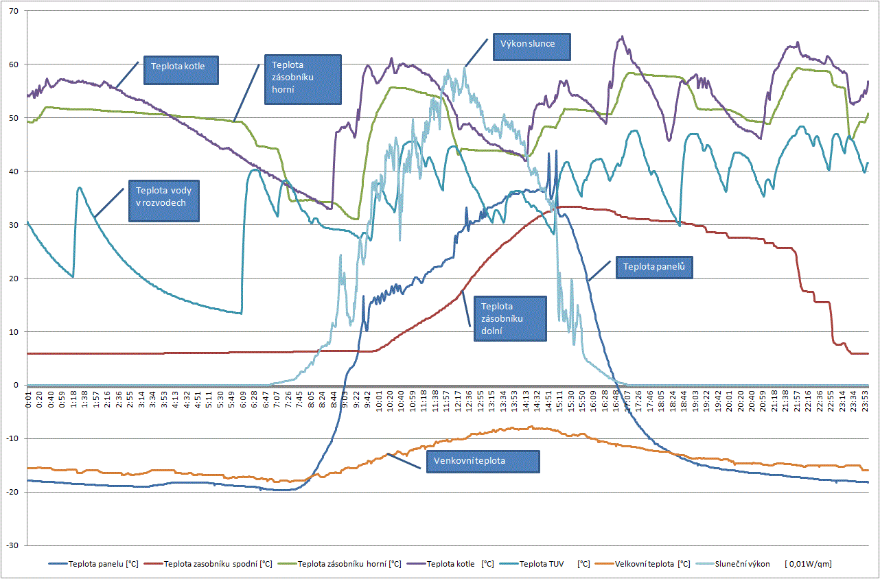 Celkový zisk energie ze slunce za sledovaný den byl 3,7kWh! Jedná se o velmi dobrý zisk. Energie ze slunce dokázala ohřát cca 300l vody z teploty 6°C na 30°C - tedy téměř na teplotu, vhodnou k mytí. Ohřev vody probíhal zhruba od devíti hodin dopoledne do šestnácté hodiny odpolední - tedy cca 7 hodin. O zvýšení teploty v zásobníku se postaral kotel na tuhá paliva, který průběžně zvyšoval teplotu v zásobníku na 55 až 60°C.