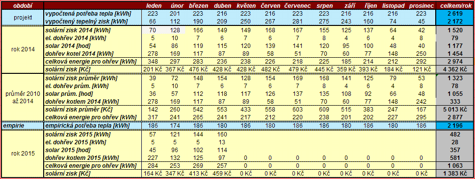 empirie - empirická potřeba tepla = empiricky - měřením, byla zjištěna skutečná potřeba energie na ohřev vody. Tato potřeba se od projektované potřeby energie liší tím, že projektovaná hodnota je vypočítána na základě standardní spotřeby teplé vody. V našem případě je však skutečná potřeba podstatně nišší. Aby se stanovila tato potřeba, byl vzat skutečný průměrný solární zisk za období červen až srpen (kdy není voda dohřívána kotlem na tuhá paliva) a k tomuto zisku je připočtena energie, spotřebovaná na dohřev vody elektrickou spirálou v zásobníku. Zbylé měsíce byly dopočítány.