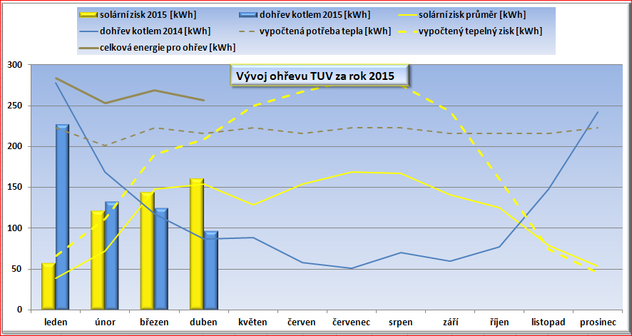 grafu je možné porovnat teoretickou potřebu teplé vody a skutečně využitý objem energie. Samostatně je znázorněna energie, vyzískaná ze slunce, dodávané kotlem na tuhá paliva a elektrickým dohřevem.