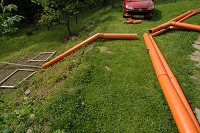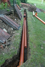 Dalším problémem byly výkopy. Strojový výkop by zřejmě udělal více škody než užitku, nebyl připraven celý průběh, postupovali jsme díl po dílu a to není vhodné pro bagristu. Ten potřebuje vyhloubit rýhy na jeden zátah a ne pořád na něco čekat. Zřejmě bych nestíhal řešit nenadálé problémy s křížením s různými trativody a odvodňovacími systémy a tak se kopalo ručně.